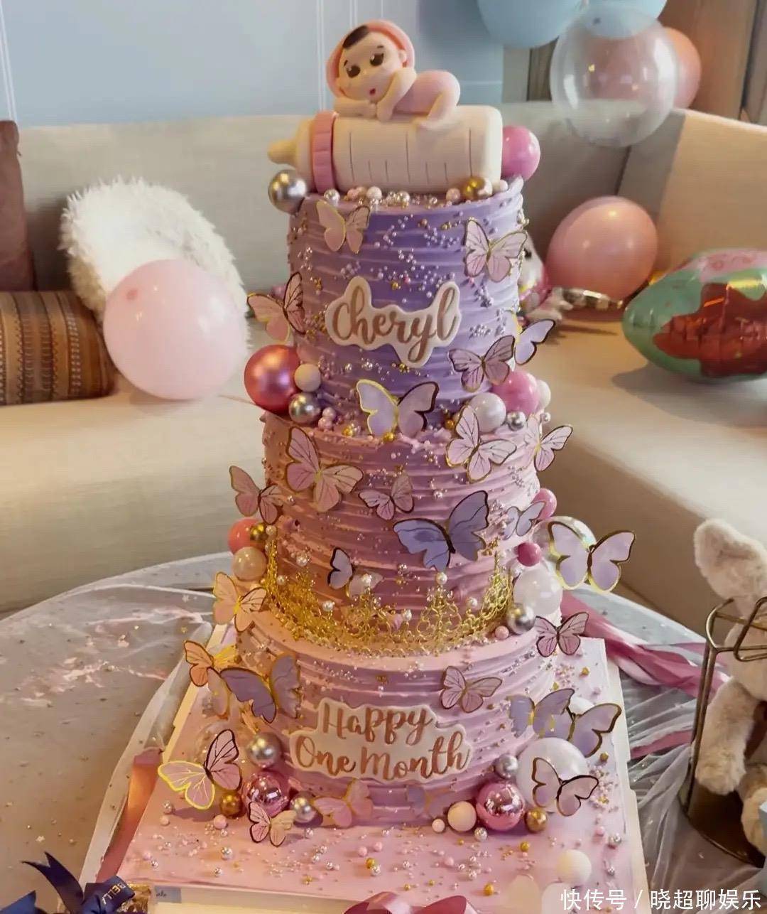 三胎女儿的生日蛋糕,更是精心安排的。粉紫色的三层蛋糕,上面满是漂亮的蝴蝶,最上层是抱着奶瓶的小宝宝,像极了三胎女儿的模样。在沙发背景的位置上,还有很多漂亮的气球。虽然只是一个简单的满月宴,却布置的非常温馨,可爱的气球、漂亮的蛋糕,都是父母的爱意。