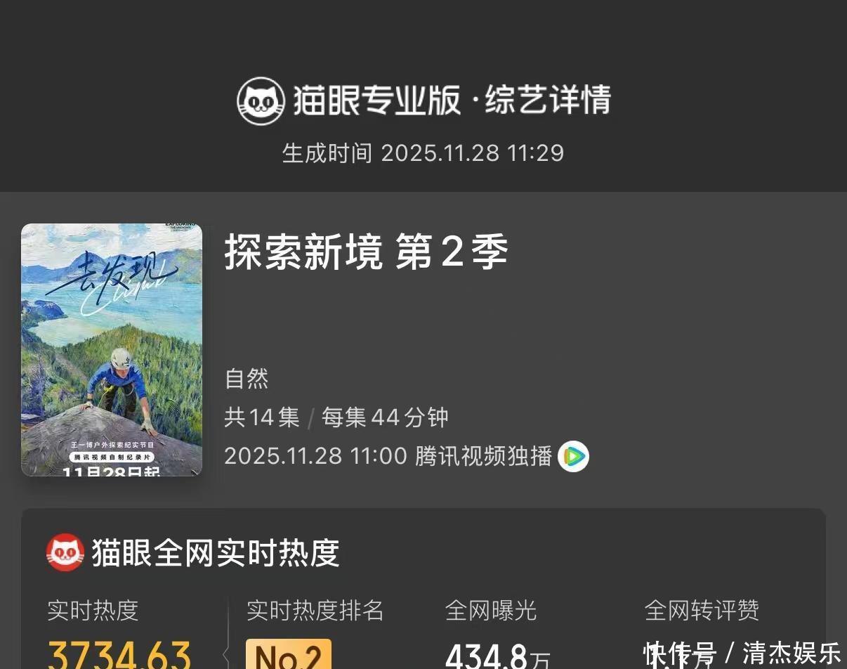 11月28号那天,王一博出演的纪录片《探索新境》第二季正式播出了。这一回,他跟同伴一起去了北美,在陡峭的悬崖上靠攀岩挑战自己。